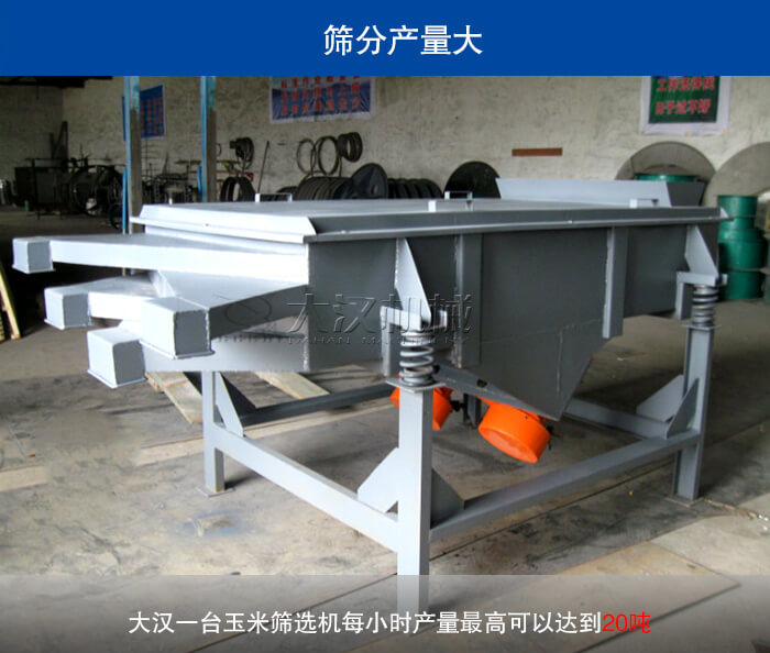 針對玉米篩選行業(yè)而言,對我們篩選機(jī)的產(chǎn)量是有要求的,大漢生產(chǎn)的玉米篩選機(jī)采用雙電機(jī)驅(qū)動,設(shè)備激振力大,而且我們的玉米篩選機(jī)加裝分料器,能有效的利用直線振動篩篩面面積,能使物料均勻分布在篩面上,大大提升物料篩分精度與蟬聯(lián),據(jù)實驗證明,大漢一臺玉米篩選機(jī)每小時產(chǎn)量高可以達(dá)到20噸。