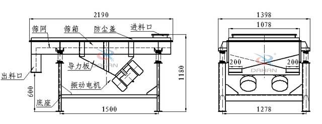 該產(chǎn)品為1000mm(寬)x2000mm(長)一層兩個出料口碳鋼材質(zhì)鐵質(zhì)網(wǎng)架結構直線振動篩篩。